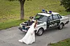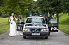 Hartveit satt i baksetet på en klassisk sort/hvitt-uniformert Volvo 240 politibil, med en kollega av brudgommen som sjåfør – også han i uniform. Brudgommen, politibetjent Christopher Amundsen, lånte den blankpolerte veteranbilen av sin arbeidsgiver Sør-Vest politidistrikt.