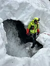– Vi fant fram sommerkartet over området, og gikk rundt med GPS for å lokalisere naturlige kulper eller hull under isen. Så peilet vi oss inn og gravde oss nedover. Det dypeste hullet vi gravde oss ned i var på 7-8 meter med hardpakket snø og is, sier Kristiansen.