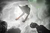 Han ser snøhaugene under dem og begynner å sikle. Endelig er tiden inne.