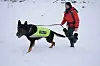 Han går bort til dommerne, som tegner opp et scenario. Det har gått et skred, sier de, og minst to mennesker ligger under snødekket. Føreren nikker, og åpner buret. Bikkja flyr ut som en rakett, men båndet holder ham igjen.