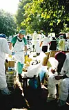 I starten foregikk arbeidet blant de omkomne som lå i solsteika og 30 varmegrader uten tilførsel av vann.
