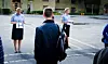Studentene stiller opp første studiedag. Bak dem ligger modulbygget til venstre og verneverdige deler av PHS til høyre.