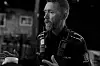 Furøy løfter en av koppene, han er kledd i uniform og skjegg. Ørepluggen er synlig fra øret.