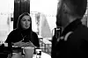 Utenfor vinduet står en mann og prater i telefonen, med halvlangt hår, skjegg og ryggsekk. Han ser oss og kommer inn.